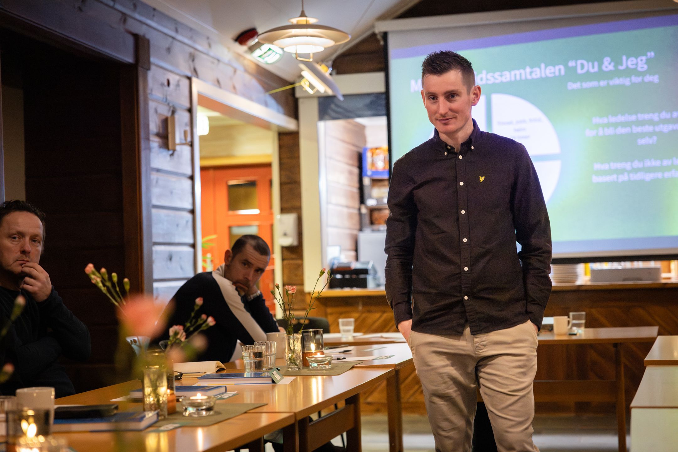 – Dere vet de klassiske medarbeidersamtalene? De er det bare å droppe, for de funker ikke. Bruk dette istedenfor, fortsetter Thor Jørgen, og peker på lerretet bak seg.