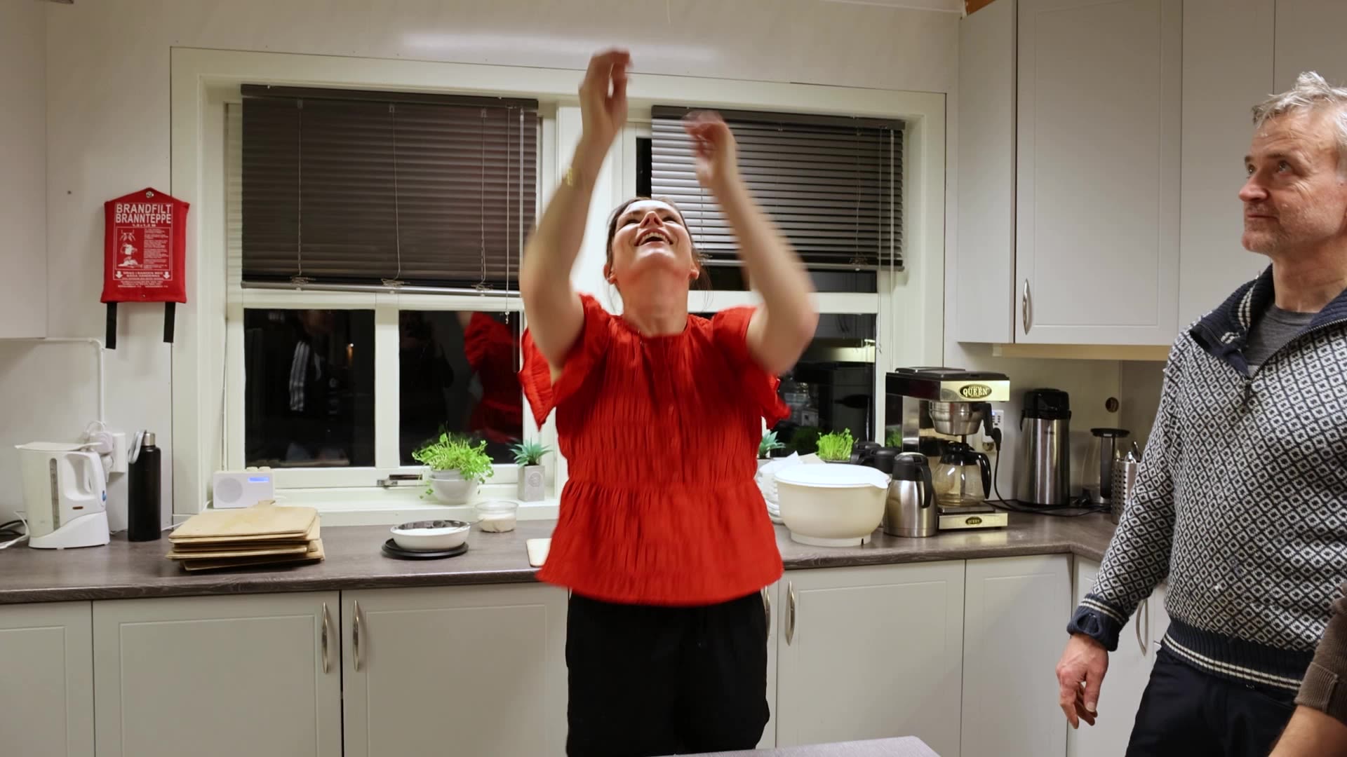 På kvelden arrangerer Hilde Konstali-Lødemel pizza-bakekurs. Alle baker ut og pynter hver sin surdeigspizza, som Jarle steker i pizzaovnen.
